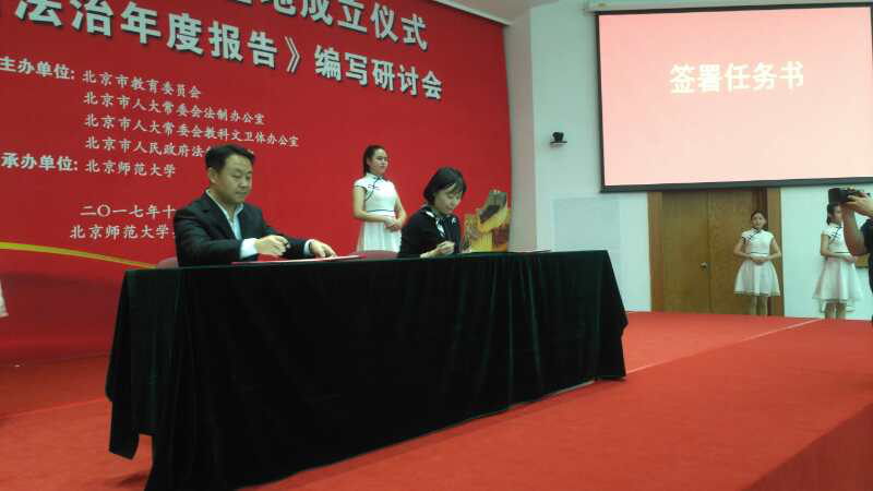 基地建设的基本情况。之后北京市教育委员会、北京市人大常委会法制办公室、北京市人大常委会教科文卫体办公室、北京市人民政府法制办公室的相关领导分别向四个基地进行了授牌并签订任务书。校长助理郭洪林代表av无码