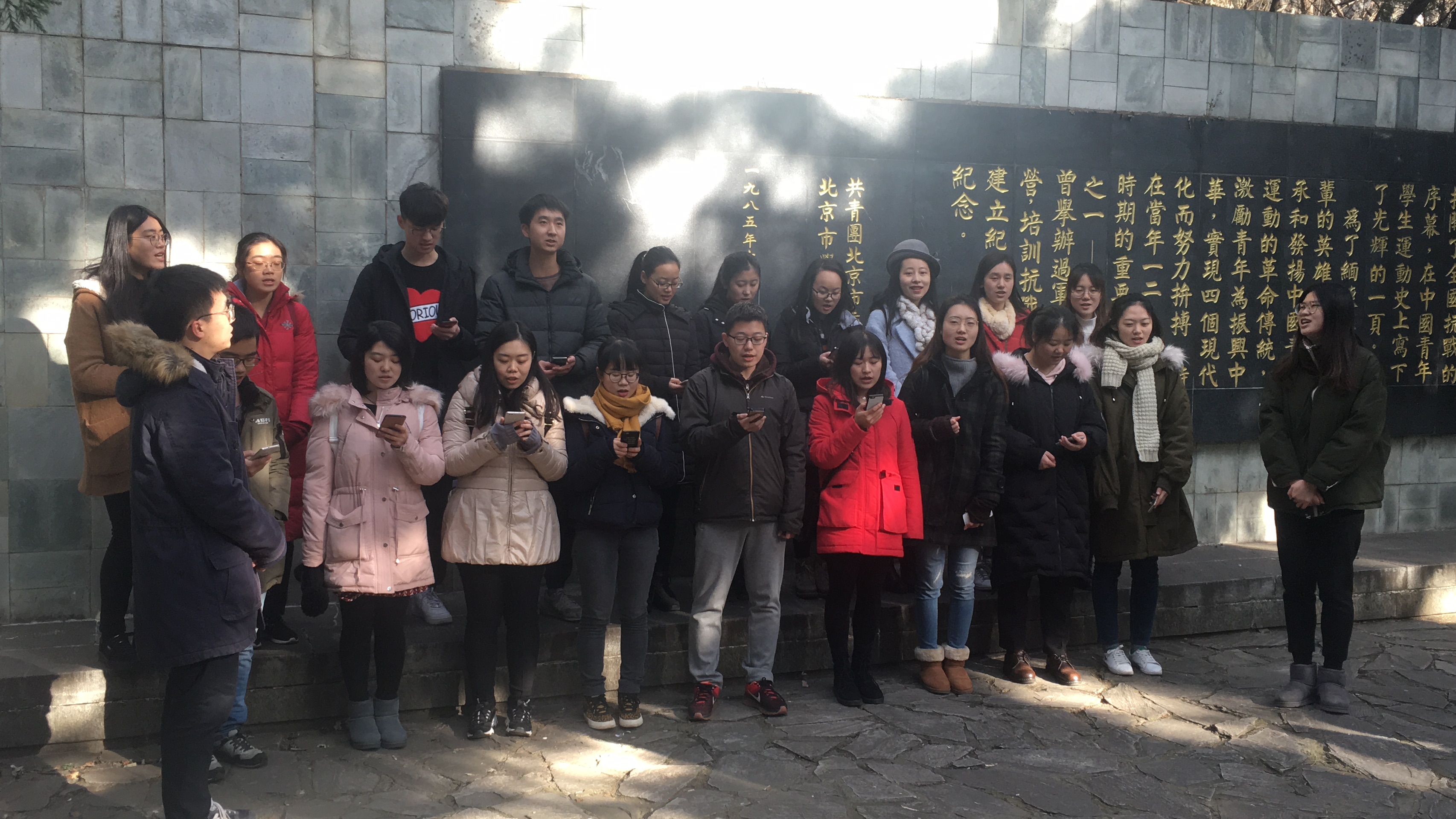 来到纪念亭,首先由2017级硕士党支部成员隋新然向大家介绍了一二·九运动的历史:“一二·九”运动是中国共产党领导的一次大规模学生爱国运动。它揭露了日本帝国主义侵略中国,并吞华北的阴谋,打击了国民党政府的妥协投降政策,大大地促进了中国人民的觉醒。