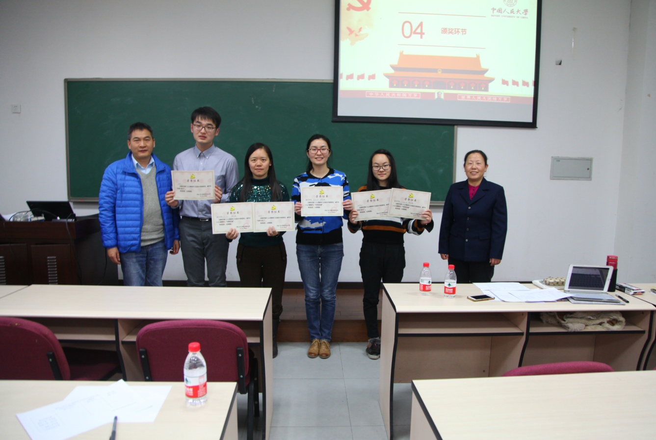 五个支部展示结束后,评委小组和现场观众分别对各支部展示情况进行了评分,结果是教职工第一党支部被评为“先锋党支部”,教师第二党支部和2017级硕士党支部被评为“优秀党支部”,汇报人胡莉芳老师、王鸿飞老师、张琼洁同学被评为“优秀主讲人”。