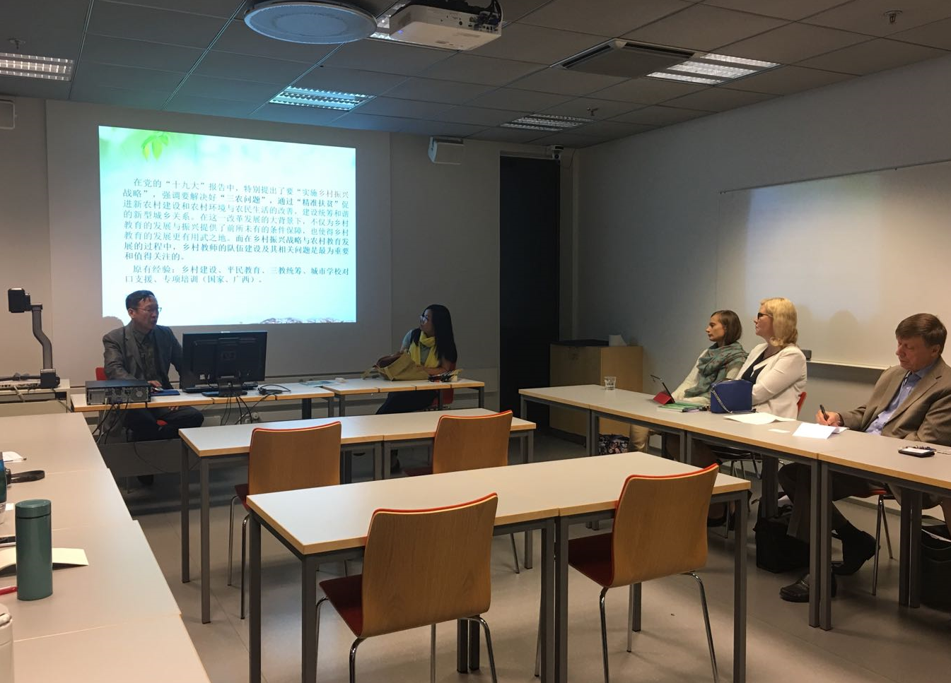 8月23日上午,程方平教授受邀以“中国传统文化”为内容做了主题发言。他特别向参会的外国朋友演示了中国书法,吸引了与会人员的广泛参与。8月23日下午,代表团会见了芬兰-中国法研究中心主任Ulla Liukkunen教授和Kimmo Nuotio教授。他们向代表团介绍了该中心的成立背景,以及在与中国开展合作当中遇到的问题。与会人员还结合当下中国一带一路战略,探讨了此战略背景下,中国法研究中心、高等教育和芬兰发展的互动关系。