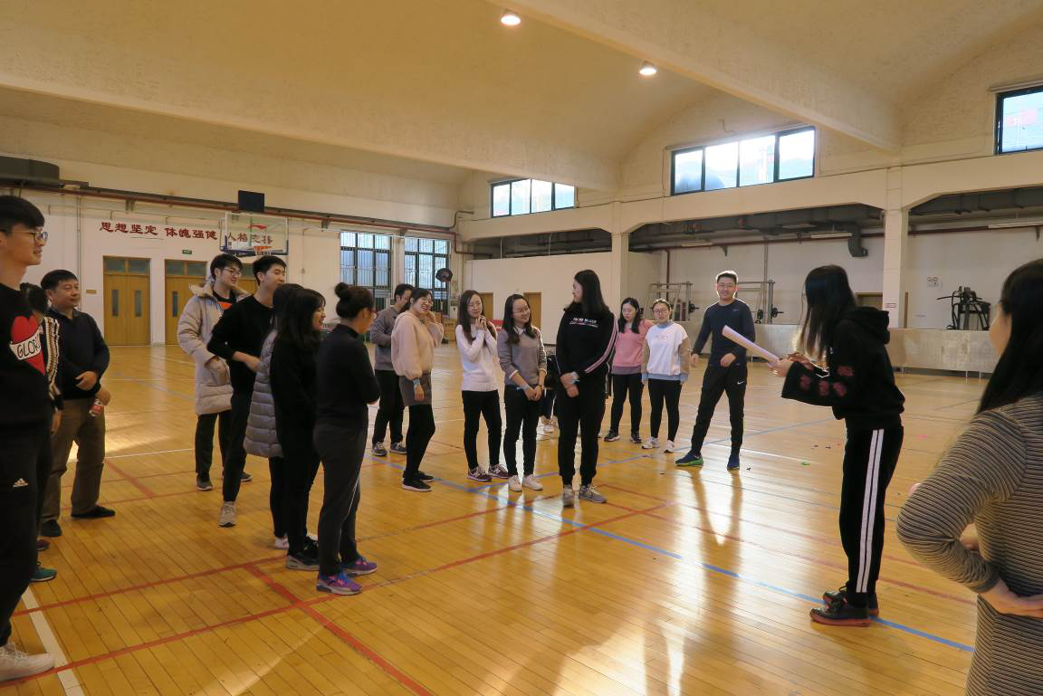 第五个项目是“串同心圆”。队员们手拉手围成一个圆,然后绕圆圈传递呼啦圈,此环节十分考验师生的默契和身体柔韧性。在上个环节落后的“梦之蓝”队一鼓作气,在此项比赛中扳回比分。