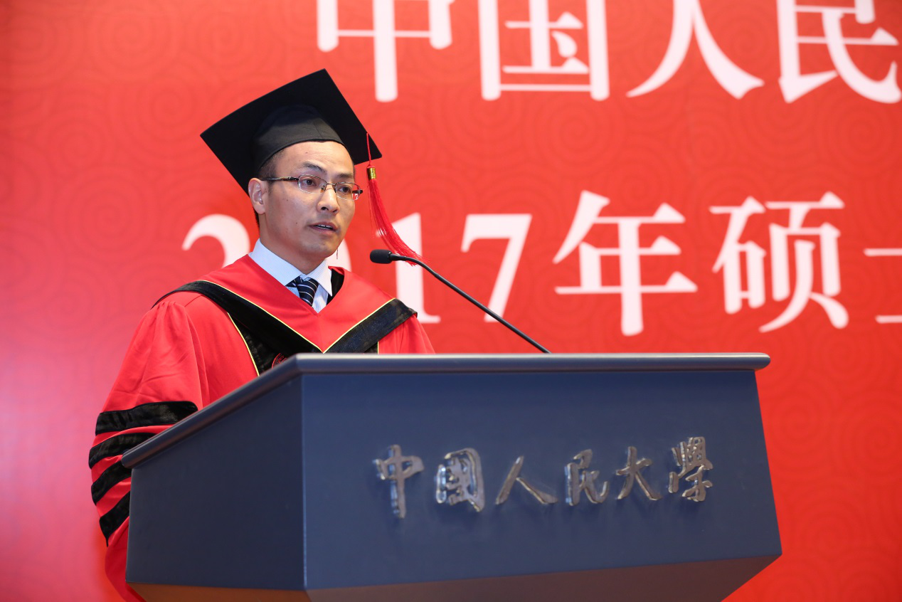 毕业生代表发言后,2015级硕士研究生班班主任叶阳永老师作为教师代表致辞,他风趣幽默地回顾了和毕业生们共度的两年时光,并向毕业生们分享了自己的人生感悟。他勉励大家,人生有不同的选择,每一种都将精彩,人生的幸福有无数种可能,每一种都很美好,并祝福各位毕业生能找到适合自己的路,前程似锦。