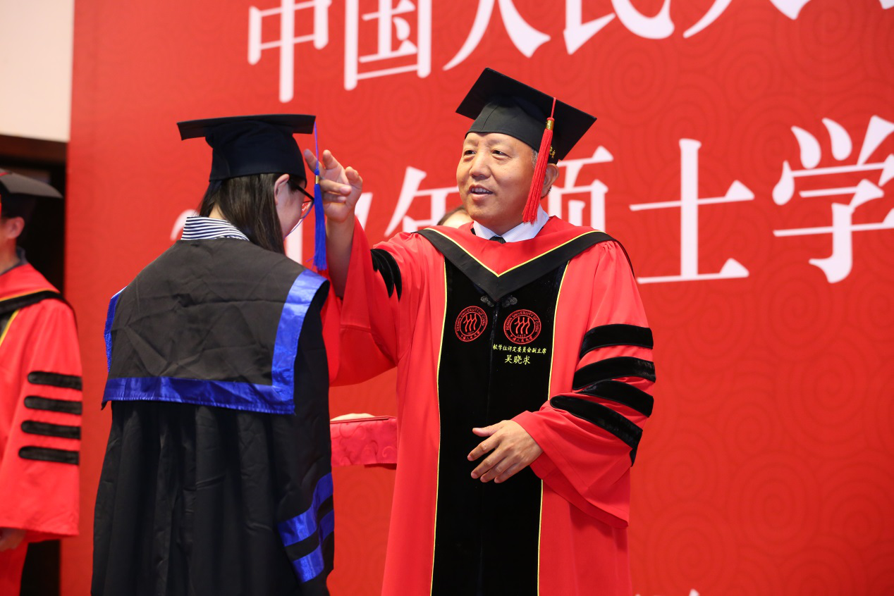 学术委员会代理主任程方平教授为硕士学位获得者逐一拨穗、颁授学位证书和学位绶带,并与其合影留念。