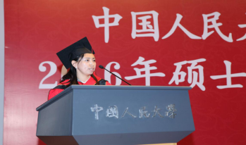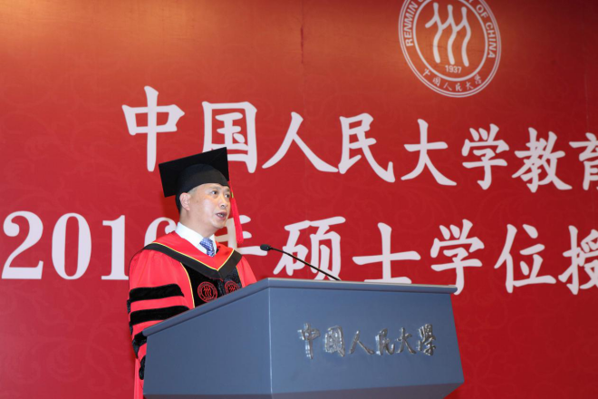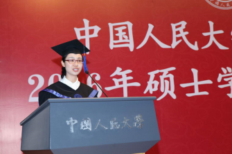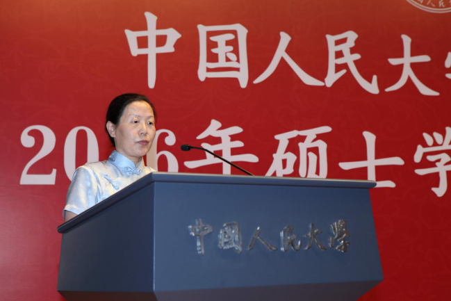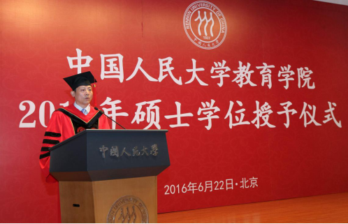 教师代表、毕业班班主任张东辉副教授致辞,她以老师和朋友的身份与各位毕业生分享三点经验:一是做一个能坚持的人;二是做一个对别人有益处的人;三是做一个有个性、有自我的人。希望大家在未来的人生道路上懂得合作、与人为善、利人利己,不要忘记在你们当中流行的毕业衫上写的那句话:人民即吾荣耀,也只有这样你们才能在未来的道路上走得更远。