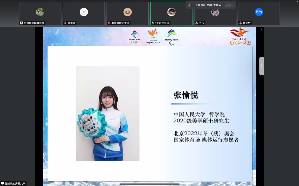 最后,同学们分享了自己参与此次活动后的感受。2021级硕士生张洪瑞同学表示,此次冬奥会显示了祖国日益增强的综合国力,奥运健儿们坚持不懈、勇往直前的精神以及冬奥志愿者甘于奉献的精神值得自己学习。2021级硕士生田达廷同学认为,此次冬奥能够在疫情之下成功举办离不开志愿者的辛苦付出,同时也希望同学们能够通过此次冬奥会多多关注冰雪运动。