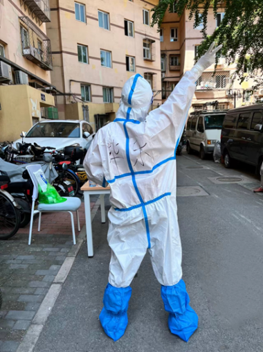 由于核酸检测工作人手紧缺,我被安排成为了负责核酸检测信息录入的志愿者。社区工作人员耐心仔细地为我们进行了培训讲解和操作示范。5月3日,我第一次穿上了医用防护服,成为了一名“大白”。核酸检测持续了两个多小时,脱下防护服的时候能感觉到自己全身的衣物都湿透了,此时也更加深刻地体会到了“大白们”顶着太阳身着防护服工作的汗水与艰辛。社区居民们也非常理解工作人员们的不容易,大家积极配合防疫工作,尊老爱幼、互相礼让又彼此关切的场面让我倍加感动。