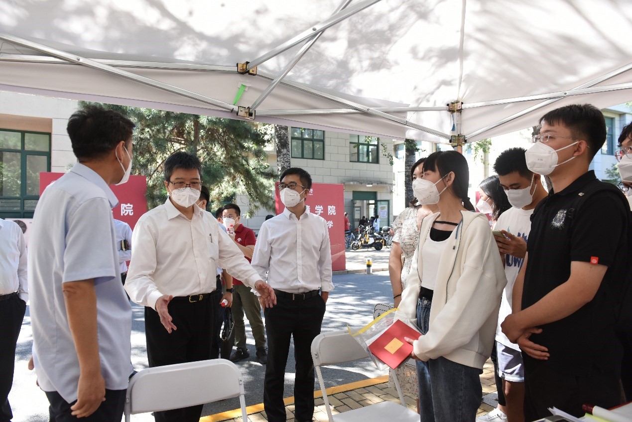 基本情况和迎新工作进展,慰问现场志愿者,并与新生同学亲切交谈。