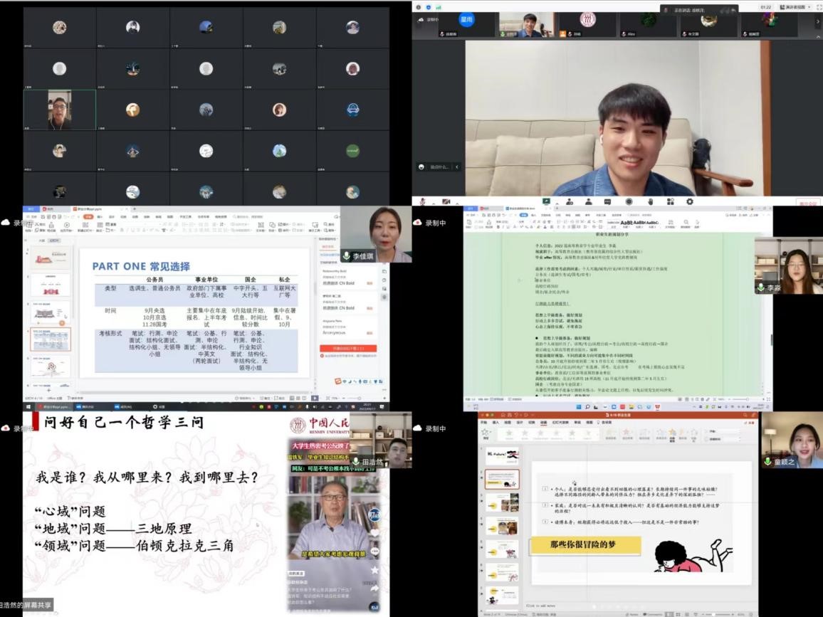 随后,五位毕业生依次分享了自己求职与求学的经历和体会。徐轶洋通过公务员考试进入了北京市委编办,他建议大家在学习上要珍惜短暂的学习时光,在生活中要悦纳自己,在求职方面要明确目标、遵从内心;李淼就职于高等教育出版社,她介绍了高等教育出版社的性质和工作氛围,并分享了自己的找工作经验;李佳琪师姐就职于北京市烟草局,她列举了如公务员、事业单位、国企和私企等常见的职业选择,并分析了不同职业选择的细分类型、考核时间与考核形式;田浩然是av无码
