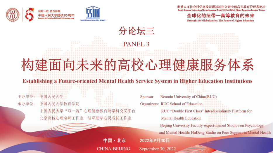 建校八十五周年,讨论如何提升心理健康服务专业化水平,扩大校园心理健康服务供给,构建更为完善的校园心理健康服务体系,世界人文社会科学高校联盟2022年会暨“全球化的纽带:高等教育的未来——全球高等教育管理者论坛”之“构建面向未来的高校心理健康服务体系”分论坛于2022年9月30日上午九点在av无码