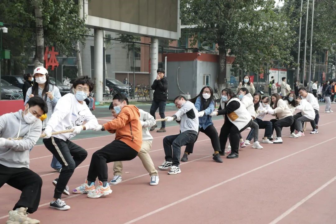 同学咬牙坚持损耗对方体力,待手中绳索稍有松动,立刻伺机反扑,大家劲往一处使,将绳索一点点拽向我方,最后赢得胜利,扳回一城;同学们士气大涨,乘胜追击,继续拿下第二局。虽然最后并未晋级,但同学们戏称本次拔河“绝处逢生”,大家通过活动增强了凝聚力,也是收获满满。