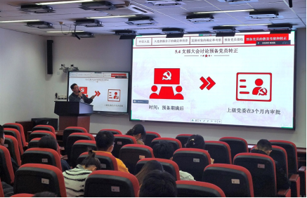 党建促进会周宇健同学介绍入党流程和党章学习重点,对入党流程、各个阶段的学习内容、所需材料以及注意事项进行了详细说明。他表示,加入党组织要有严格的流程和规范,入党申请人要对照各阶段标准,严格按照要求,完成理论学习、材料准备、社会实践、考察考核等环节。