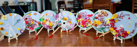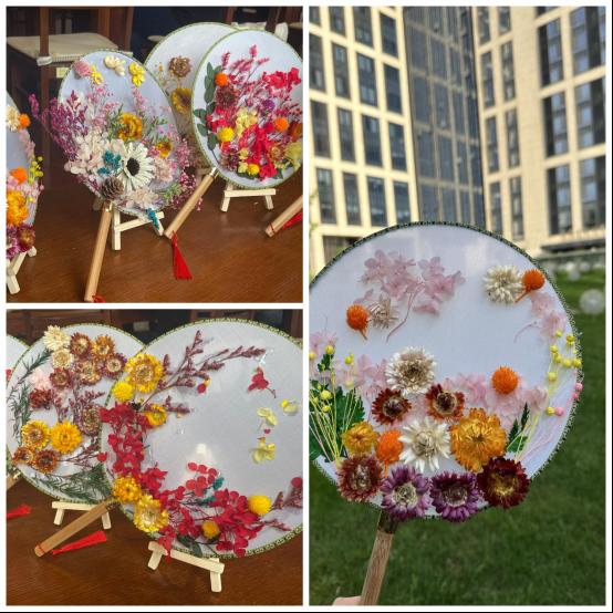 研究生会为本次活动准备了团扇、干花包、胶水、支架等制作材料,以及零食饮料。参与师生在挑选制作材料后巧妙构思、精心制作,或模仿成品视图、或创意自制图案,将花叶饰物模拟摆放、调整后堆叠粘贴到团扇上完成制作,活动流程在温馨的氛围中进行。参与师生交流了团扇制作感想,将团扇摆放后一齐合影留念并进行户外打卡。