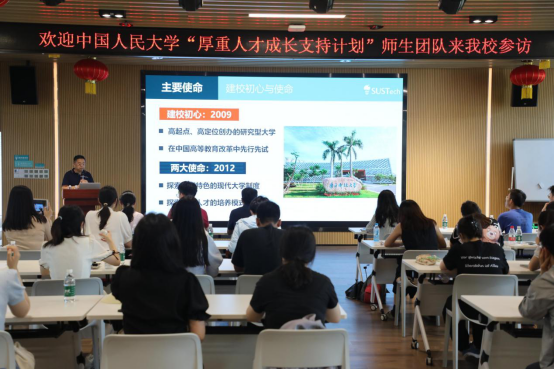 发展历程、学科规划建设、师资队伍建设、人才培养进展、国际交流合作等方面介绍了南方科技大学的整体建设情况,并从本校出发分析了深圳高等教育发展状况。双方就高水平国际化办学、学生工作创新、书院制建设、导师制建设、书院文化氛围营造、书院学生组织管理等方面进行了讨论分享。
