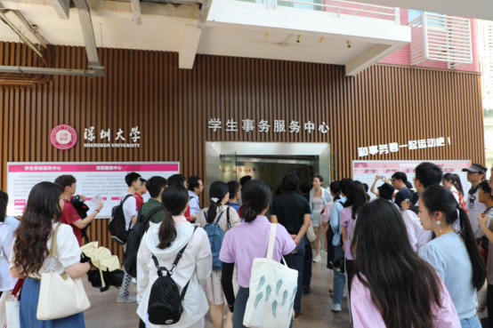 工作人员为项目成员介绍深圳大学学生事务服务中心硬件设施与运行情况