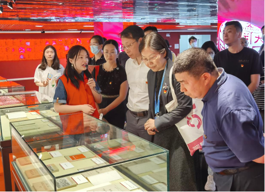 首任校长17年”“文字改革和推广普通话历史研究”“淳朴家风”等多方面的殊勋茂绩与伟大风范。在讲解员的引导下,师生党员集体观摩了吴玉章老校长的手稿、藏书、衣物、生活用品与纪念品等287件珍贵实物,一一了解其背后的动人故事。张晓京与讲解员及参与党员交流分享观展感想。