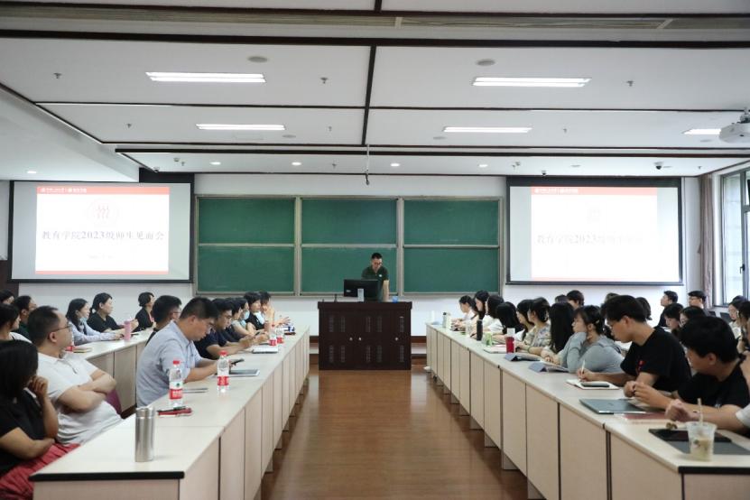 纪委书记、副院长胡莉芳向新生逐一介绍了每位行政职工的工作职责与专任教师的研究方向。2023级硕博新生依次作自我介绍,展现了新时代人大教院学子积极向上的良好精神风貌。