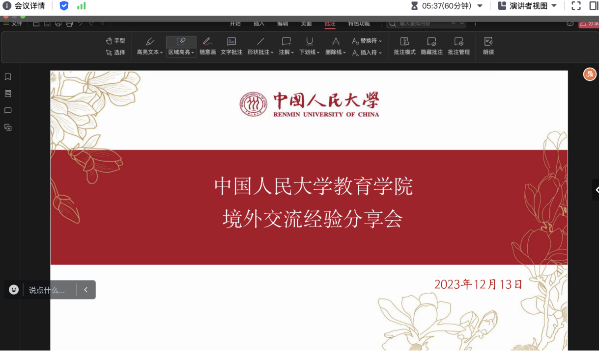 2018级硕士毕业生金赛君、2021级博士研究生郑佳、2022级博士研究生王子渊、2022级硕士研究生李梓怡、2023级硕士研究生王思源先后分享参加境外交流活动的经历与经验。本次活动由av无码
