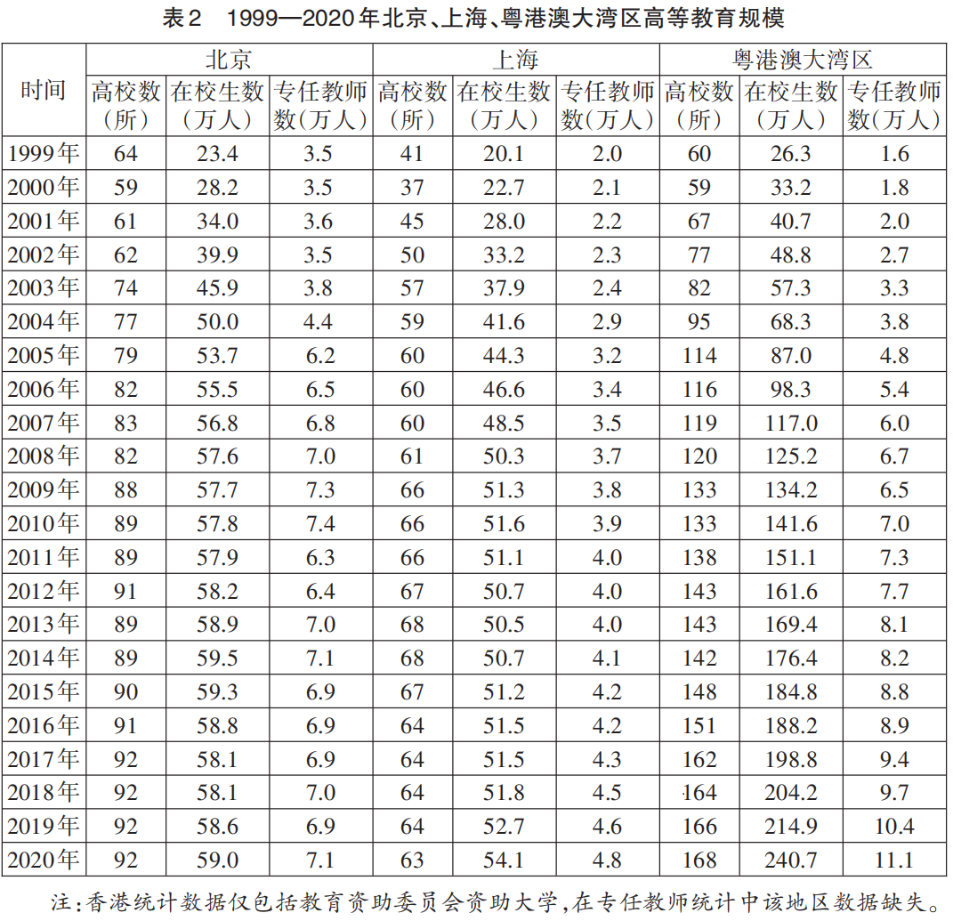 1.高等教育规模。表2呈现了北京、上海及粤港澳大湾区的高等教育规模。统计显示:①高校扩招以来,北京、上海、粤港澳大湾区的高等教育规模不断扩大,且粤港澳大湾区扩张态势突出,高校数量由1999年的60所增加至2020年的168所,普通高等av无码
