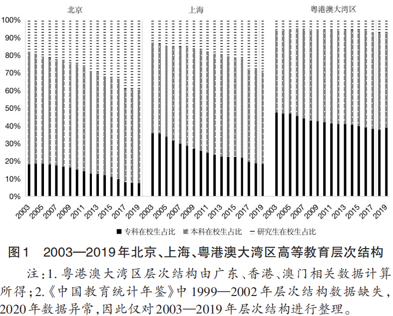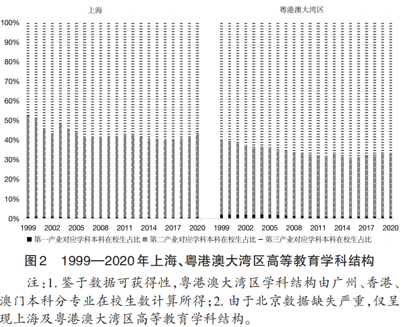 在校生数(本专科)表示,办学层次结构以专科、本科、研究生在校生占比来表征,学科专业结构主要以一、二、三产业对应的本科专业在校生占比来指代,因为本科生是高等教育的主要组成部分。研究数据由《中国城市统计年鉴》《中国教育统计年鉴》《中国统计年鉴》、北京、上海、广州、深圳、佛山、香港等地统计年鉴及粤港澳大湾区统计专页相关数据整理所得,个别异常值及缺失值采用插值法进行处理。