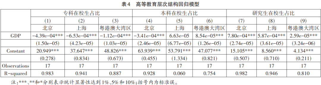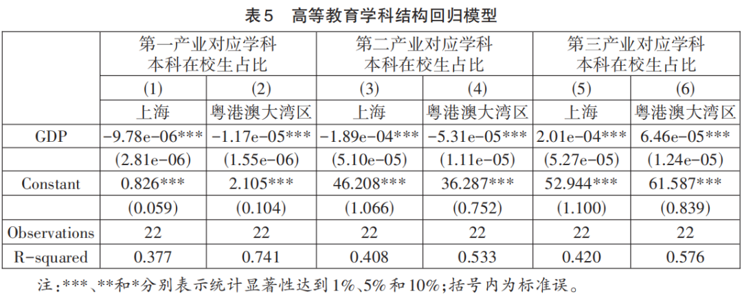 在校生数、各层次高等教育在校生占比、各学科专业高等教育本科在校生占比为因变量建立高等教育规模、办学层次结构及学科专业结构的回归模型,如表3~5所示。从统计检验结果来看,除以上海本科在校生占比为因变量的回归模型外,各模型F统计量的p值趋近于0,回归模型高度显著;GDP显著性水平达到1%;拟合优度基本大于50%,具有较高的解释力。从回归结果来看,GDP的增长对高等教育规模、研究生在校生占比与第三产业对应学科专业本科在校生占比具有显著正向影响;对专科在校生占比、第一二产业对应学科专业本科在校生占比具有显著负向影响;对本科在校生占比的影响呈现地区差异性。