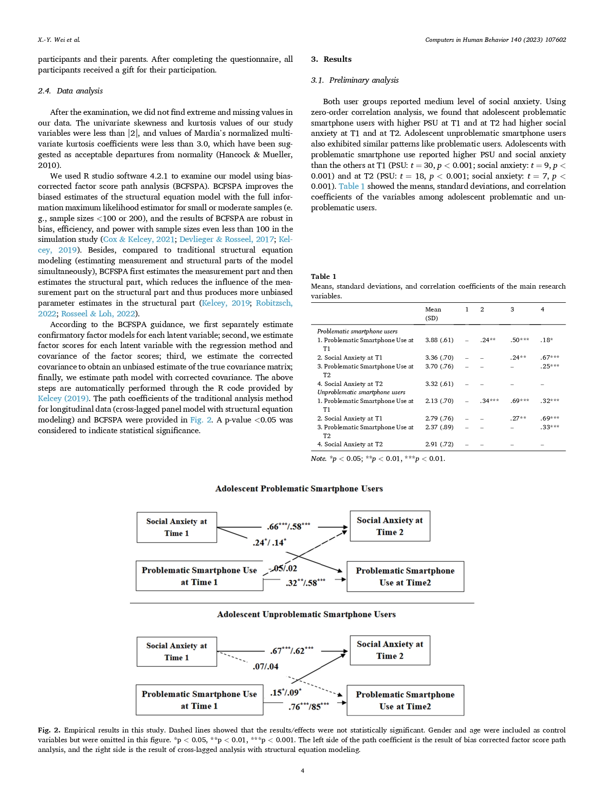 ABSTRACT:Smartphone provides diverse indirect communication channels for users, which may attract people with social anxiety. Due to the high risk of developing social anxiety and problematic smartphone use (PSU) in adolescence,it is important to investigate whether social anxiety will trigger PSU or vice versa among this group in the smartphone era. Also, most previous PSU studies include amounts of unproblematic smartphone users in the analyses, which may“muddy the waters.”Participants were 582 adolescent smartphone users (including 201 problematic users) who completed the investigation at time 1 (T1) and time 2 (T2). A bias-corrected factor score path analysis (BCFSPA) was adopted to estimate data with small or moderate sample size. BCFSPA showed that social anxiety at T1 positively predicted PSU at T2 among problematic (vs. unproblematic) smartphone users.Also, PSU at T1 positively predicted social anxiety at T2 among unproblematic (vs. problematic) smartphone users. Our results have identified social anxiety as a risk factor for PSU among adolescent problematic (vs. unproblematic) smartphone users; the compensatory Internet use model combined with the habit theory of addiction can explain this finding. Besides, the dilution effect hypothesis can explain the effect of PSU on social anxiety among unproblematic (vs. problematic) smartphone users.