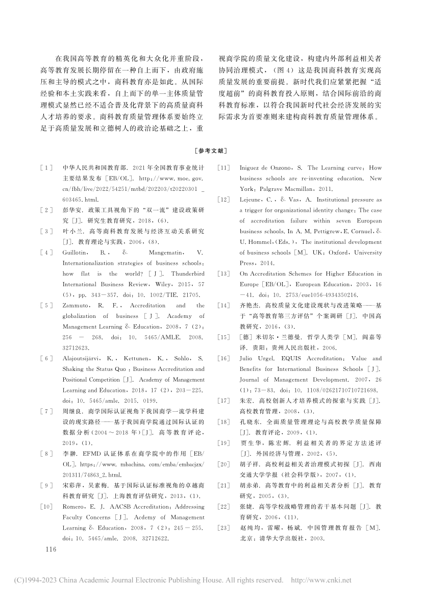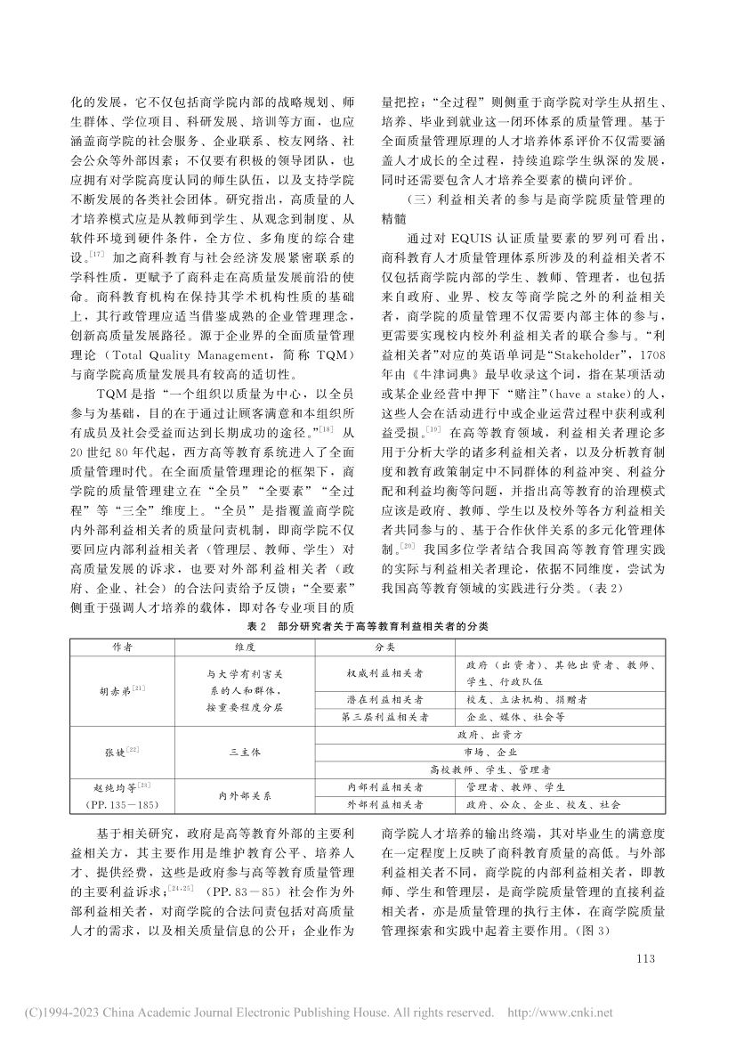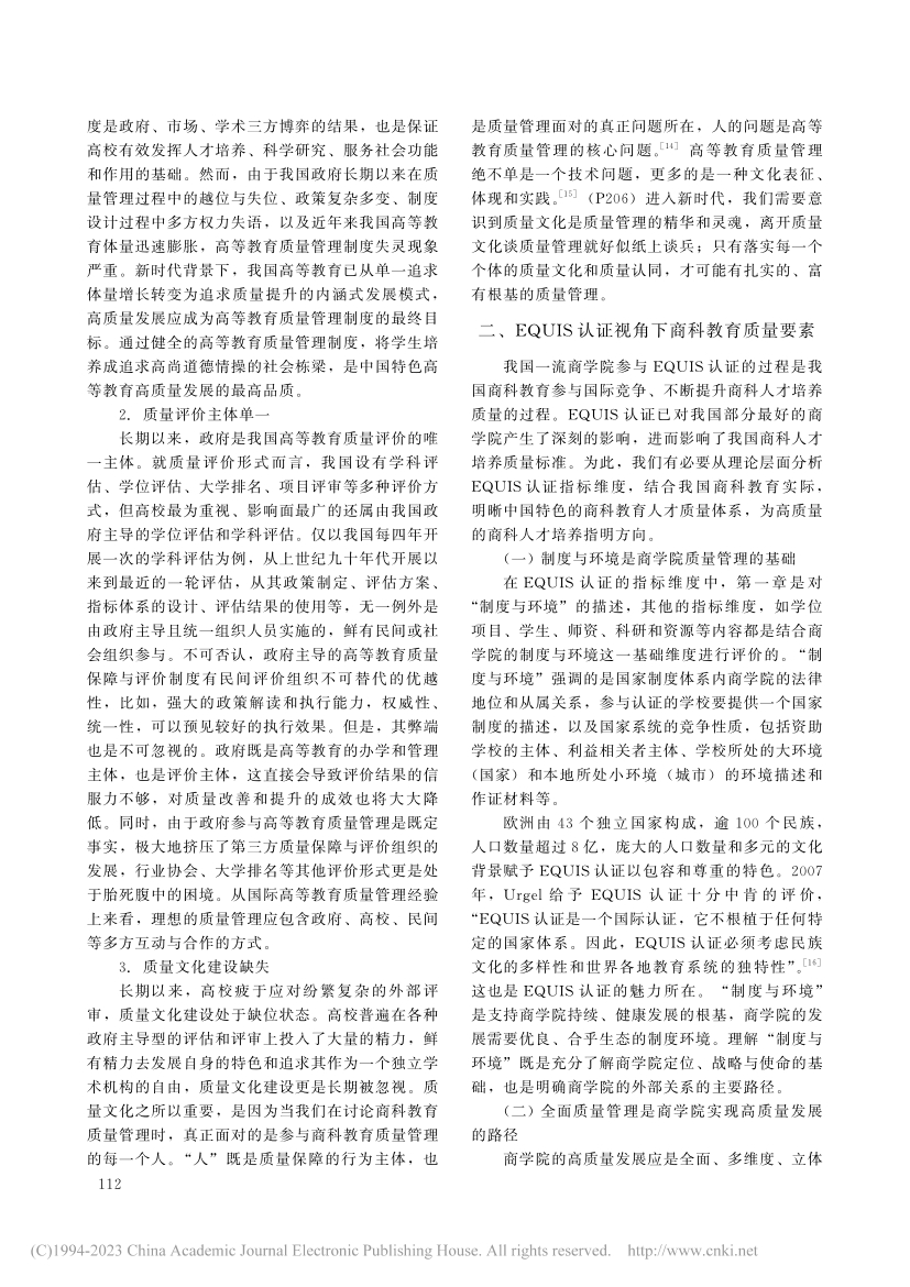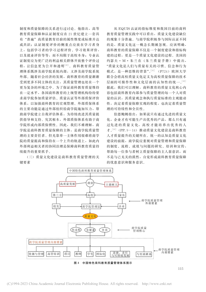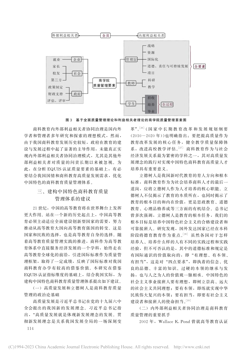 均通过参与该认证体系来保障和提升商科教育质量。结合国际前沿的商科教育质量管理理论和EQUIS认证的质量指标维度,建构中国特色商科教育质量管理体系是我国商科教育发展的一个核心目标。高质量发展和立德树人是我国商科教育质量管理的政治论基础,内外部利益相关者协同治理是商科教育质量管理的重要抓手,质量文化建设是商科教育质量管理的关键要素。