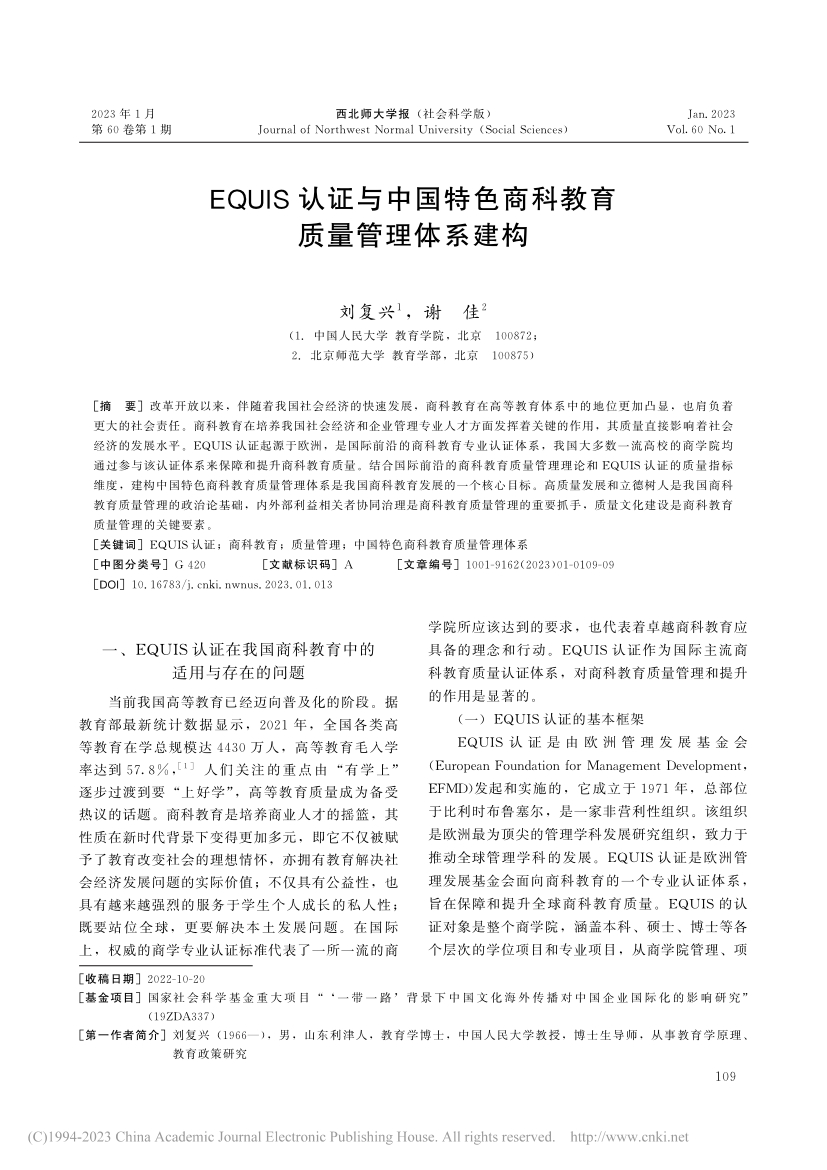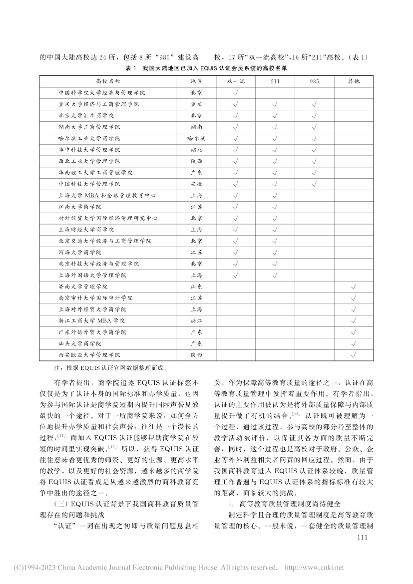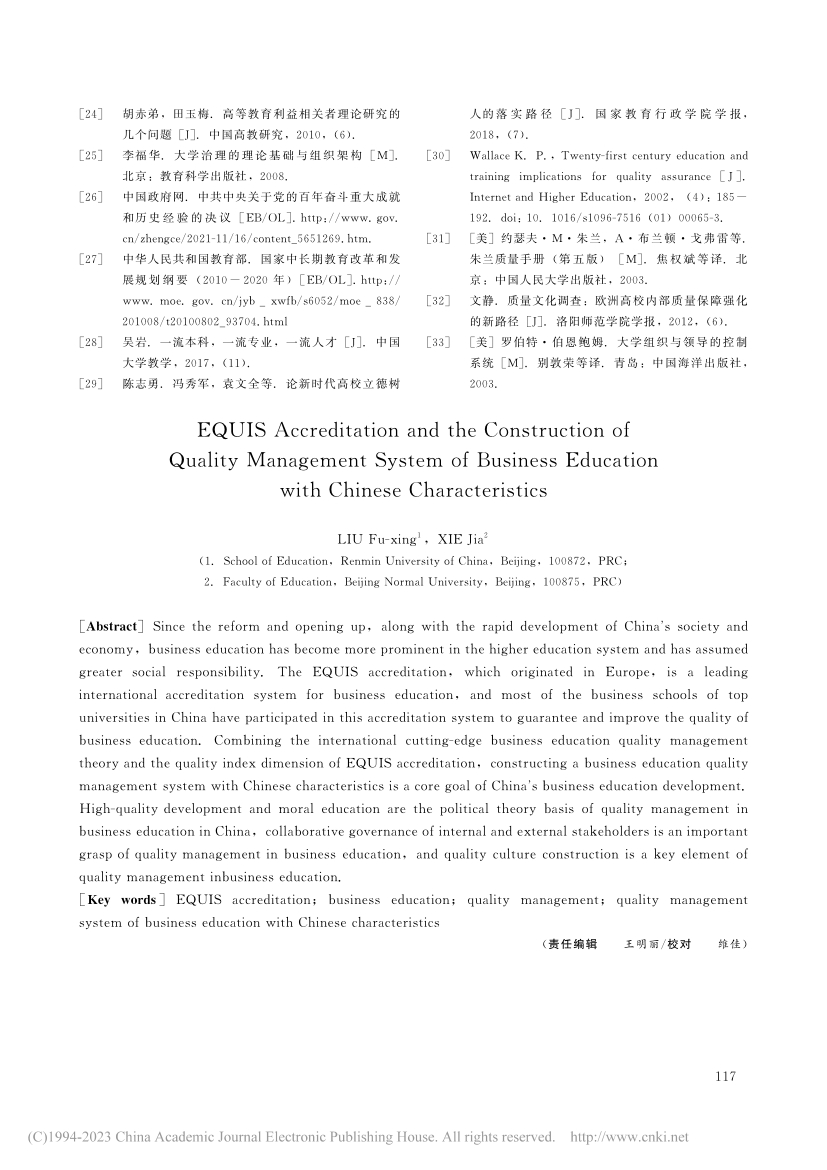 关键词:EQUIS认证;商科教育;质量管理;中国特色商科教育质量管理体系