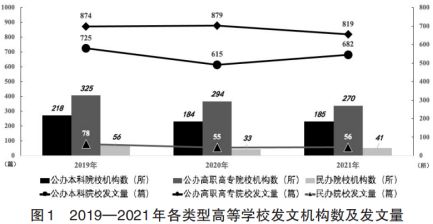 从发文数量上分析,2021年公办本科院校共发文682篇,占发文总量的37.72%,校均3.69篇(2020年发文占比为33.03%,校均3.34篇);公办高职高专院校共发文819篇,占发文总量的45.30%,校均3.03篇(2020年发文占比为47.21%,校均2.99篇);民办院校共发文56篇,占发文总量的3.10%,校均1.37篇(2020年发文占比为2.95%,校均1.67篇)。相比2020年的贡献占比,公办本科院校和民办院校的占比均有所提升,尤其是公办本科院校的占比提升较大;与之相应的是,公办本科院校的校均发文数也提升较大,相比其他两类院校,优势进一步扩大。