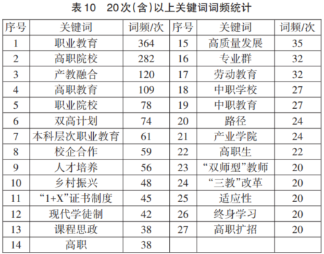 、行会社团、企业等组织,支撑、服务、引领职业教育发展的社会空间。学术期刊是研究者发表研究成果,获知学术前沿,展开争鸣与讨论的无形场域。跟踪我国职业教育科研论文的发表情况,系统总结和梳理研究成果与学术发展趋势,是全面提升职业教育研究水平、加速实现职业教育高质量发展的重要途径。