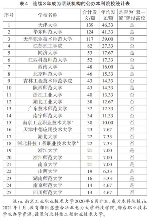3. 连续发文活跃机构情况对比分析。从时间维度上考察,将连续3年发文4篇(含)以上的机构归类为职业教育研究活跃机构。2019—2021年连续发文4篇(含)以上的公办本科院校共25所,分别占到2019—2021年度公办本科院校活跃机构数量的54.35%、69.44%、65.79%。(见表4)2019—2021年连续发文4篇(含)以上的公办高职高专院校共37所,分别占2019—2021年度公办高职高专院校活跃机构数量的51.39%、54.41%、53.62%。(见表5)这显示了连续活跃机构已经占据了职业教育科研贡献版图的核心位置且地位稳固。