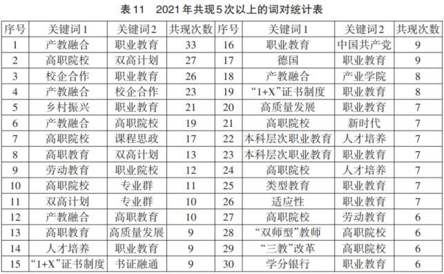 科研论文是学术研究成果的记录载体和交流方式,而论文关键词作为论文的重要元素,是表征研究主题的词汇,能够有效反映职业教育改革发展的重要政策热点和研究热点以及他们之间的互动关系,进而反映职业教育研究的整体状态。关键词之间的连接关系反映了研究者对研究热点的关注程度,两个关键词共同出现的次数反映着两个研究热点或研究议题间的互动程度。